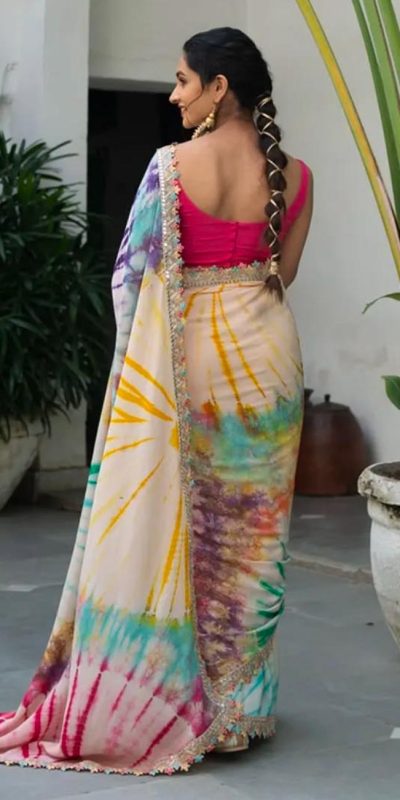 Fabrics Saree :Pure shibori printed Chinon fabric saree with Beautiful Multicolored Embroidery Coding Sequins Lace work :Embroidery Coding Sequins Lace