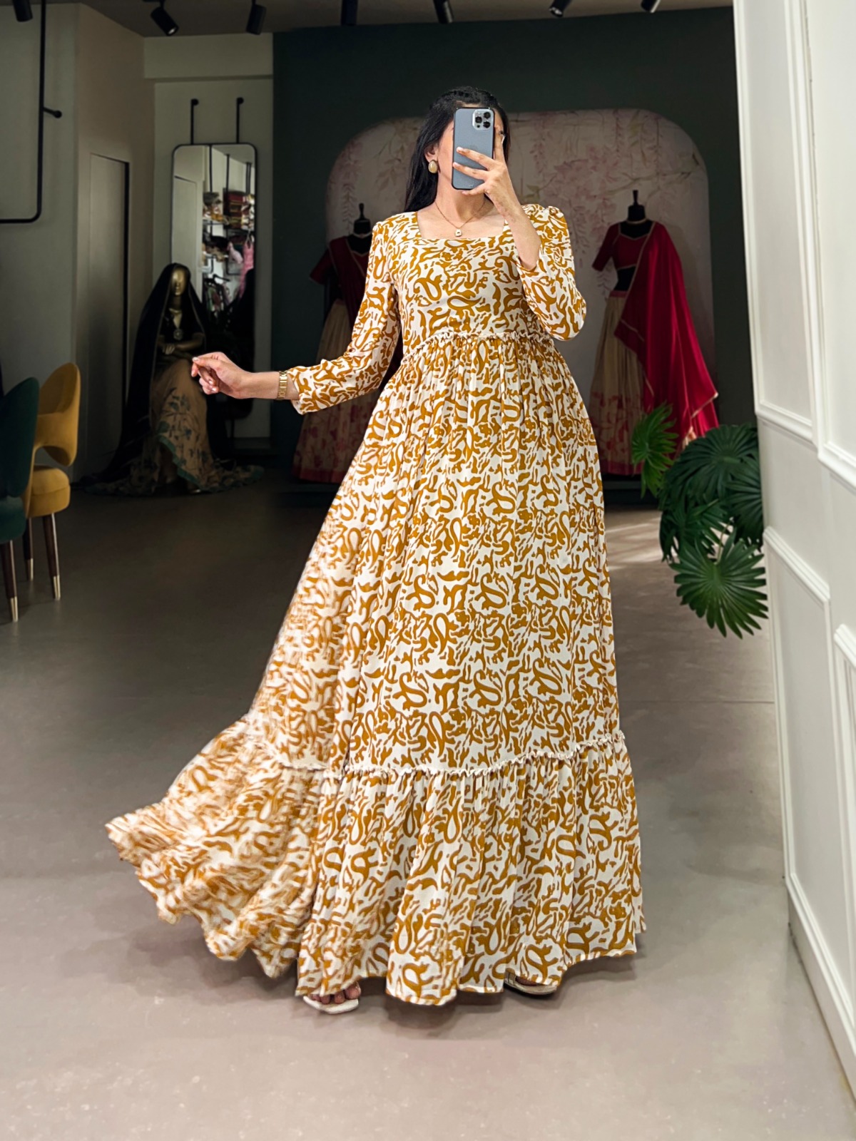 | Fabrics | Gown Gown Fabric : Georgette Gown Work : Printed Chest Size : 38” (M) (Inside 2 inch extra margin support up to 40 for your body comfort) Waist Size : 38" Shoulder : 15" Sleeve Length : 18" Length : 57" Flair : 4.50 Meter Lining : Cotton (full upto bottom) |