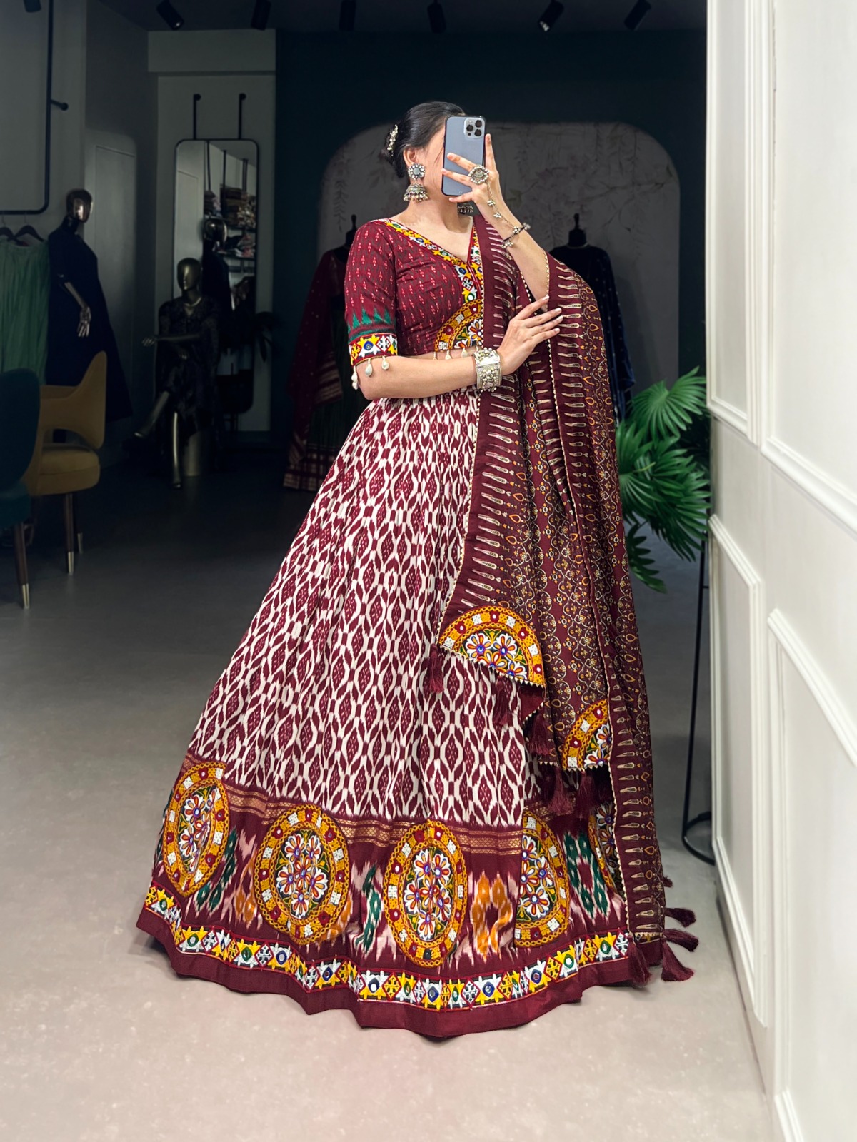 Lehenga Work : Ikkat Print With Foil Work And Original Mirror Gamthi Work