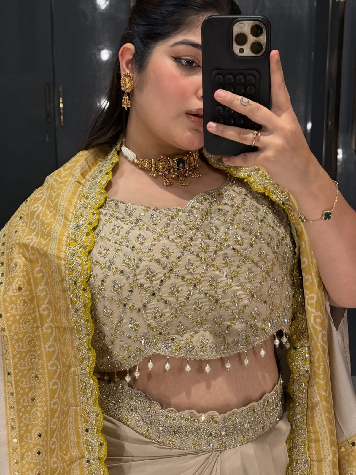 Work: -; Bandhani Print With Real Mirror & Embroidery Lace Work |