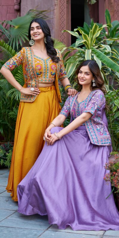 Mustered Vichitra Embroidery Thread Work Lehenga Choli