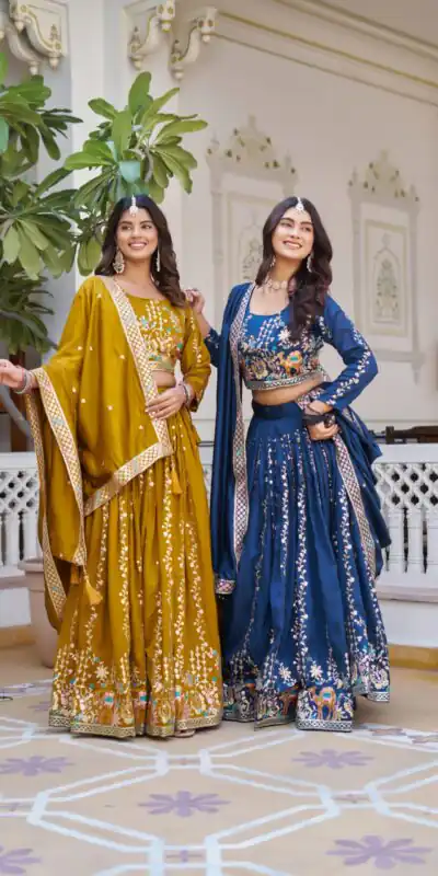 Mustered Vichitra Embroidery Work Lehenga Choli