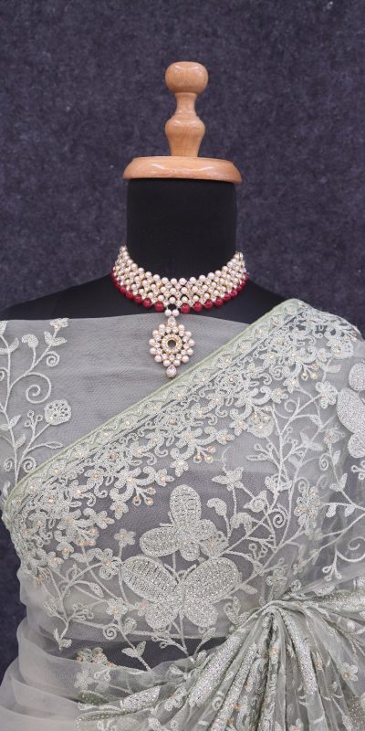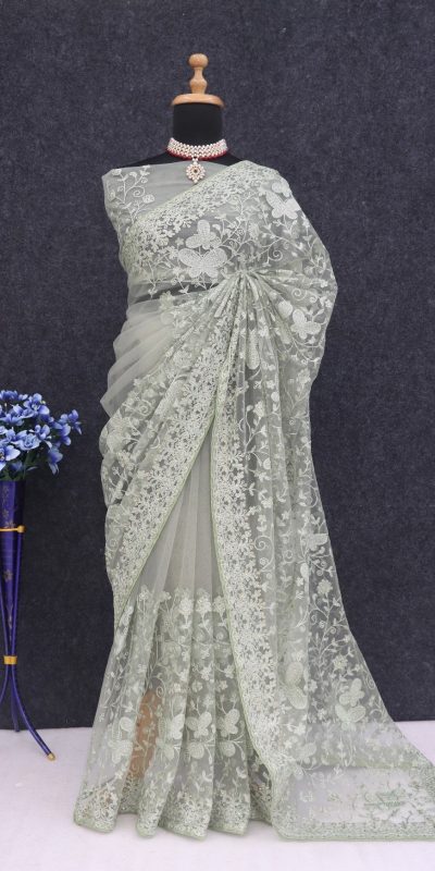 Mystical Green Color Butterfly Net Embroidery Sequence Saree