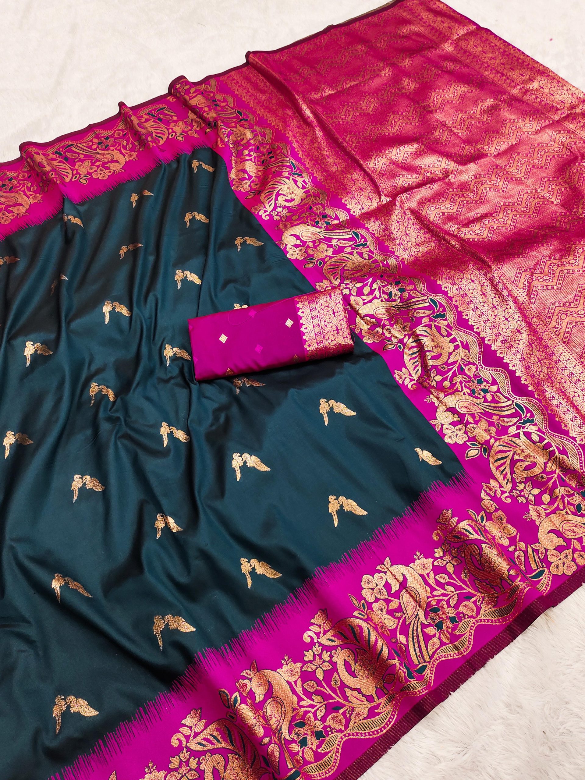Saree :- Soft And pure banarasi silk saree with self weaving design all over the saree & zari weaving Contrast Matching Rich pallu with zari weaving unique border & heavy Rich Pallu.