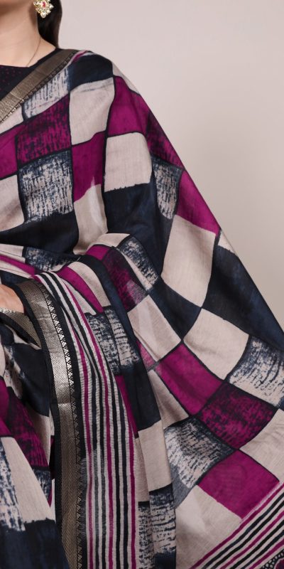 Navy Blue Chanderi Printed Saree