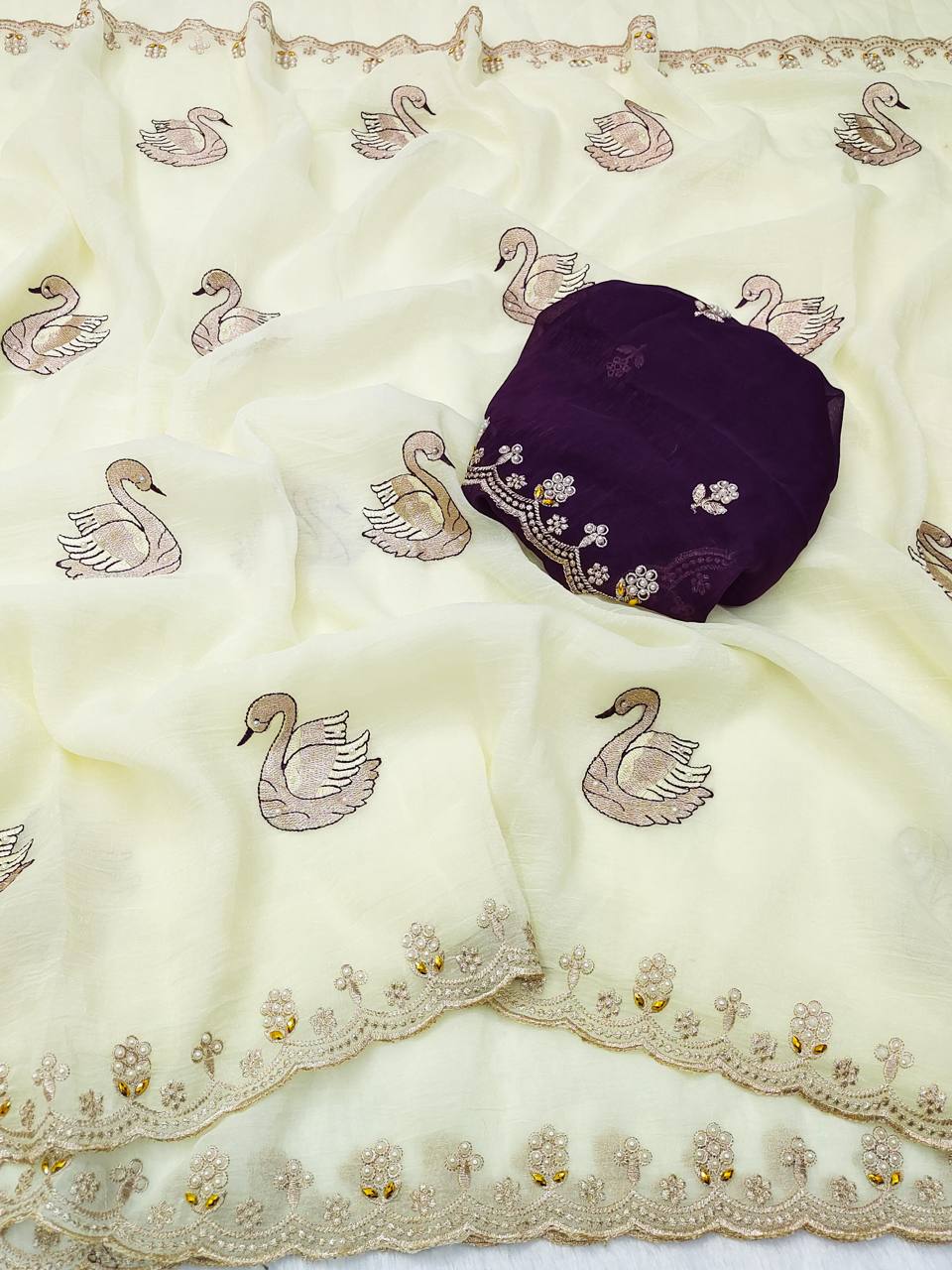 Saree Detail Saree Fabric : Crunchy Chiffon Saree Flower embroidered and Both Hand Moti Work & Diamond Work with Contrast Embroidery Blouse Piece. Blouse Fabric : Crunchy Chiffon Saree Cut : 5/50 |