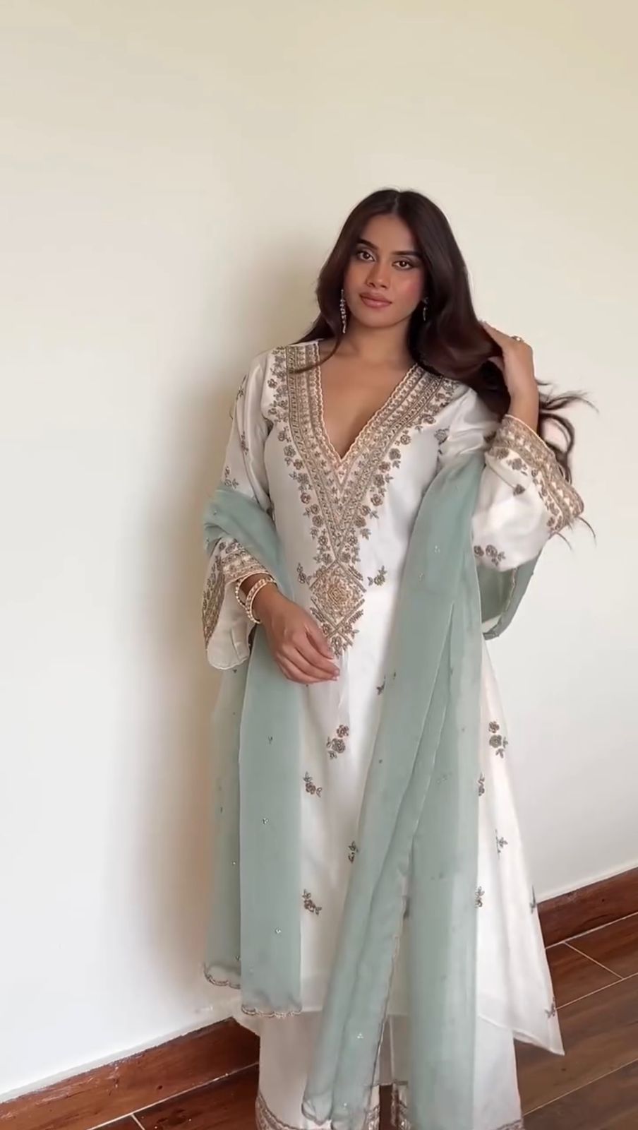 “The salwar suit’s dupatta is generously sized. It can be draped in various styles, adding versatility to the overall ensemble.”