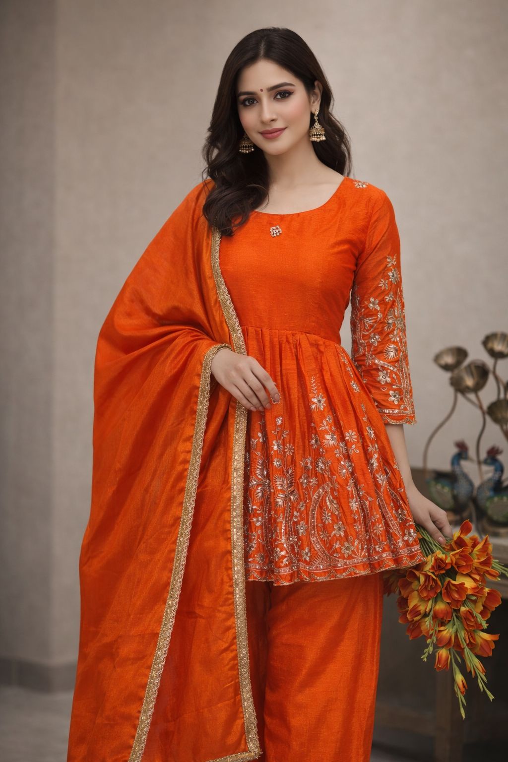 Orange Chinon Silk Embroidery Work Salwar Suit