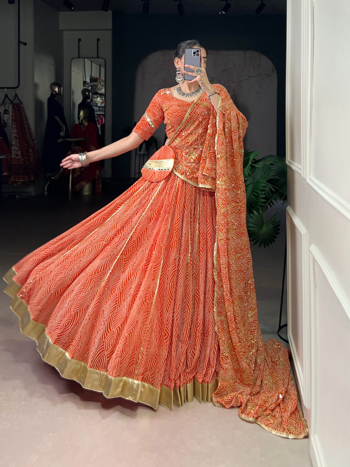 Lehenga Work : Bandhej Print And Embossed Design Lace With Gota Patti Touch Up
