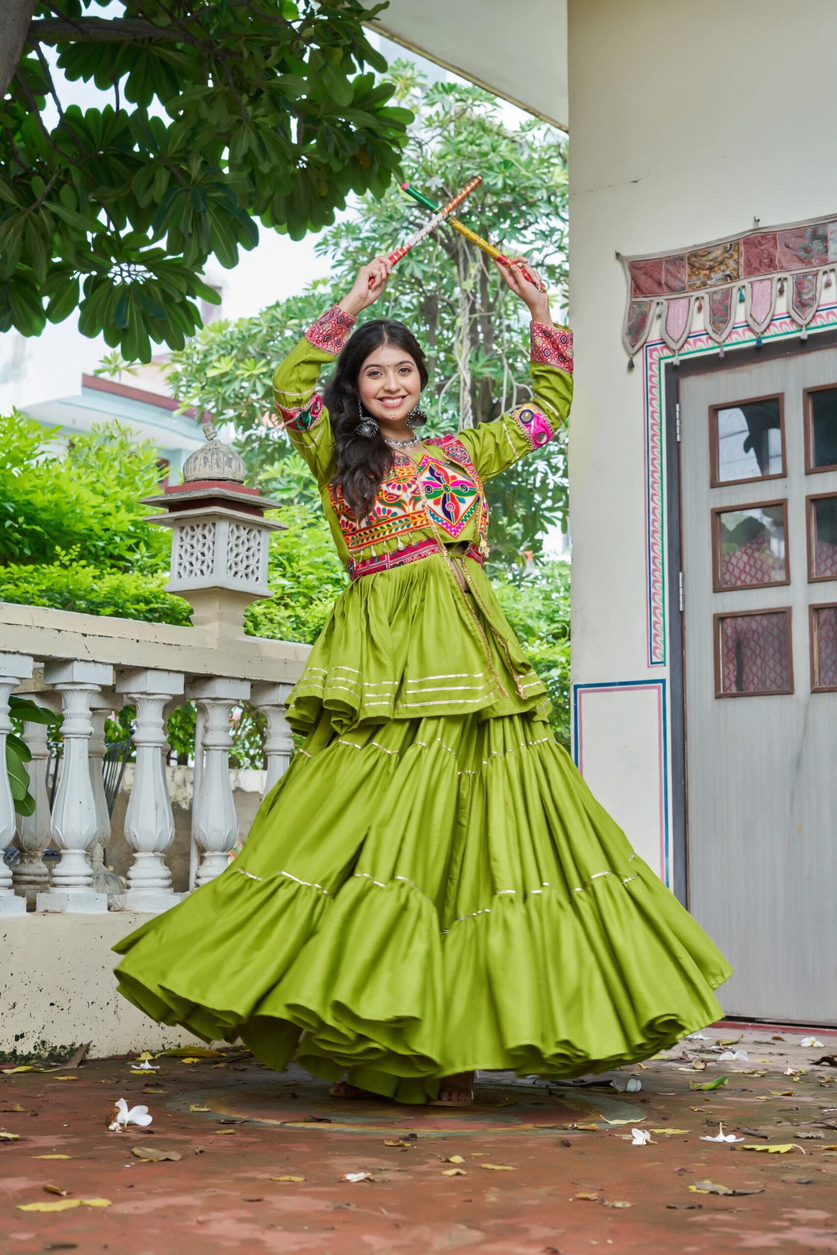 Parrot Green Pure Cotton Mirror Gamthi Work Lehenga Choli
