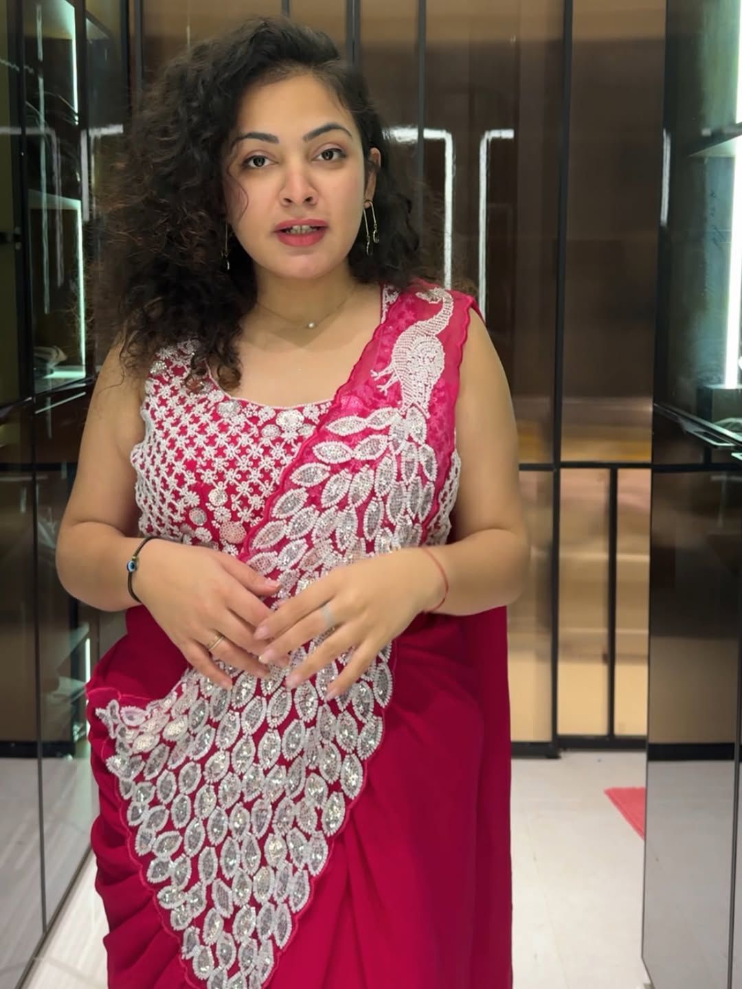 Loved my satin silk Indian saree, rich wine tone aur fluid fall; candle‑light dinner, cocktail, har jagah compliments hi compliments mile.