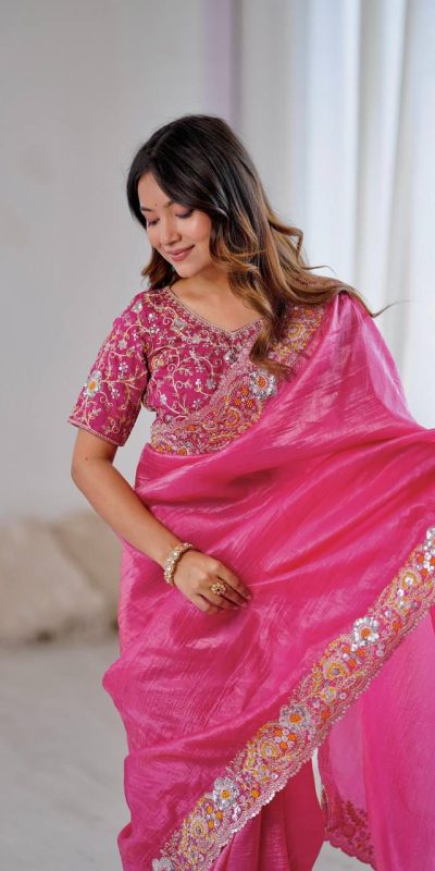 Saree Detail Saree Fabric: Premium Gold Crush Silk Saree Work : Heavy Embroidery Threads Codding & Sequins Work Blouse Fabric : Premium Gold Crush Silk |
