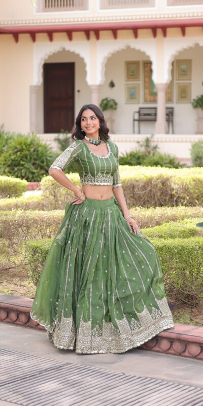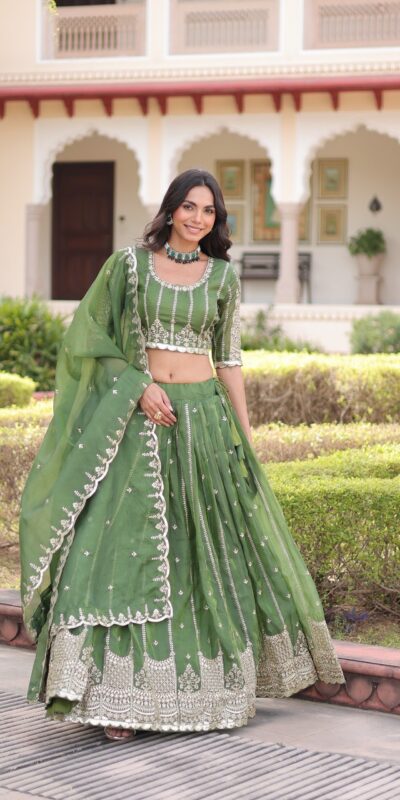 Pista Gold Crush Embroidery Zari Work Lehenga Choli