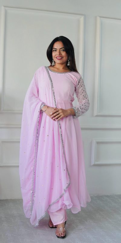 | Fabrics | Gown Fabric :heavy Foix Georgette With Embroidery Work And Full Sleeves Gown Inner : Micro Cotton Gown Size : Free Size Sami stitched Gown Length : 51-inc Gown Flair : 5-mtr Fully Stitched Bottom Fabric :heavy Micro Cotton And Elastic Dupatta Fabric :fox Georgette And Four Side Embroidery Work And Lace Border |