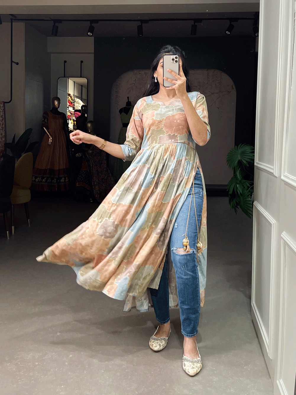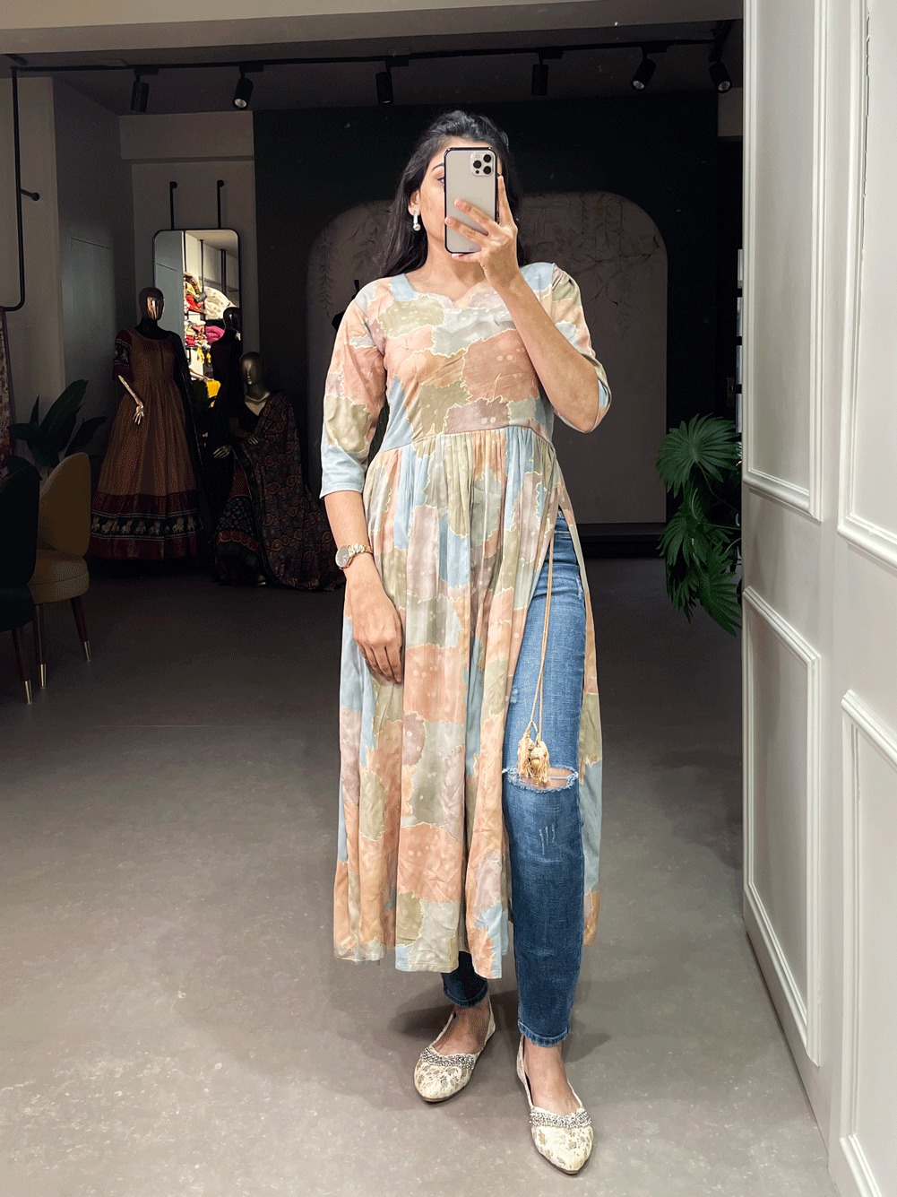 Pretty Chiku Color High Quality Rayon Cotton With Foil and Printed Drawstring With Tassels Kurti