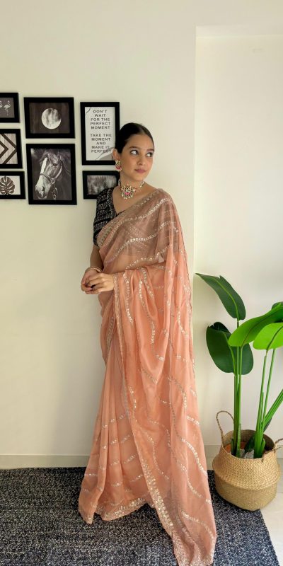 AC BROWNIE Peach Color Soft Organza Zari With Sequence Saree Blouse :Heavy Velvet Casual, Wedding, Festive, Events Expected Delivery 4-6 Working Days @1999