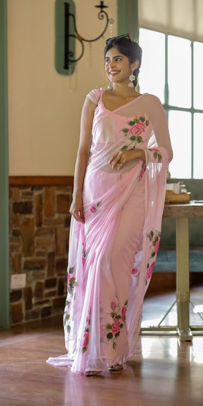 | Fabrics | Saree Fabric : Pure Soft Georgette Silk Design : flower design on all over the body and pallu Ready To Wear saree beautiful color combination All over the body Blouse : Pink color banglory silk running unstitched blouse piece |