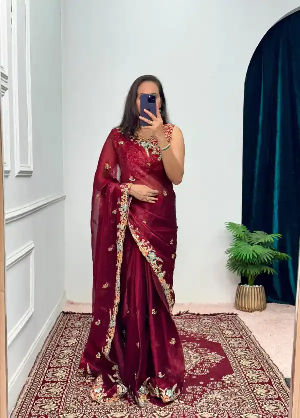 ST 472 Red Color Burberry With Blooming Embroidery Saree Casual, Wedding, Party, Festive, Events Etc. Expected Delivery 4-6 Working Days @1999/-