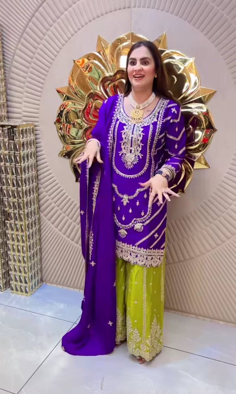 Palazzo fabric :Pure Heavy Chinon Silk With Heavy Embroidery Coding Sequence Work (Fully Stitched)