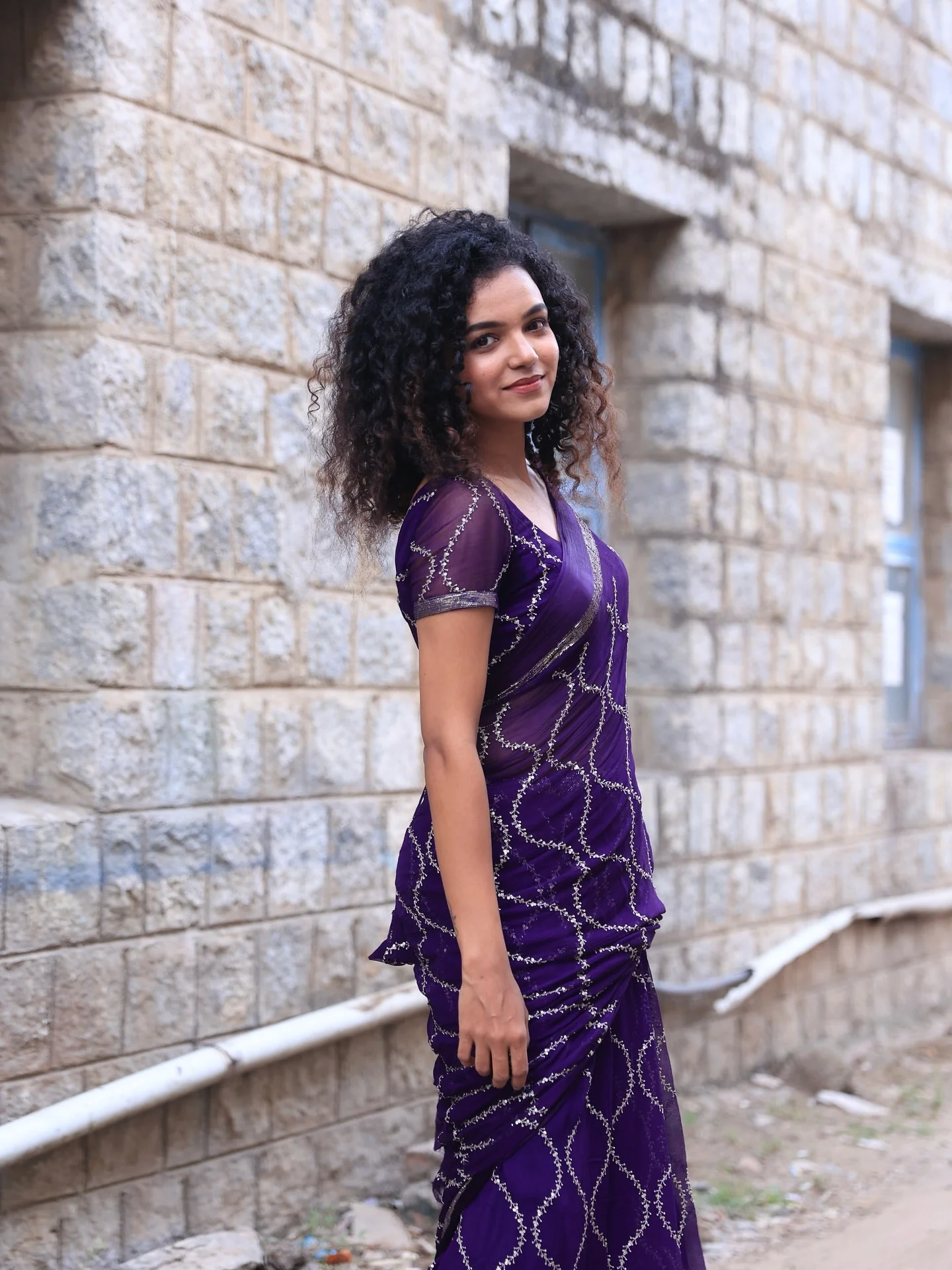 Purple Viscose Satin Sequin Embroidery Work Saree