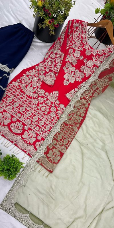 Red Faux Georgette Bead Embroidery Work Salwar Suit