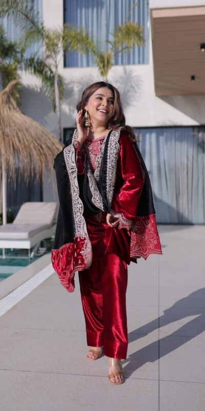Red Ice Velvet Embroidery Zari Work Salwar Suit