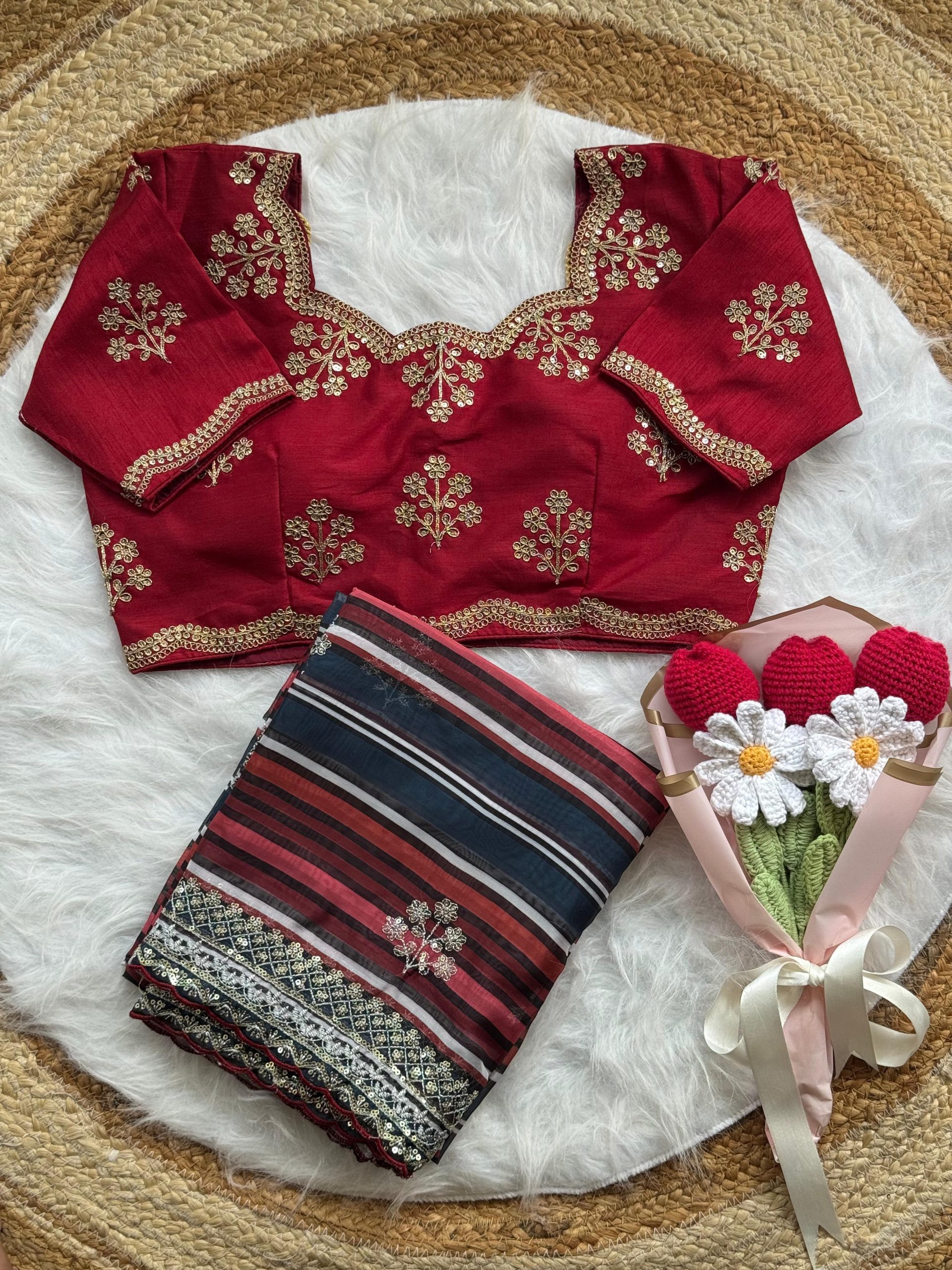 “I appreciate the transparent sizing information provided. The blouse and petticoat fit perfectly with the saree.”