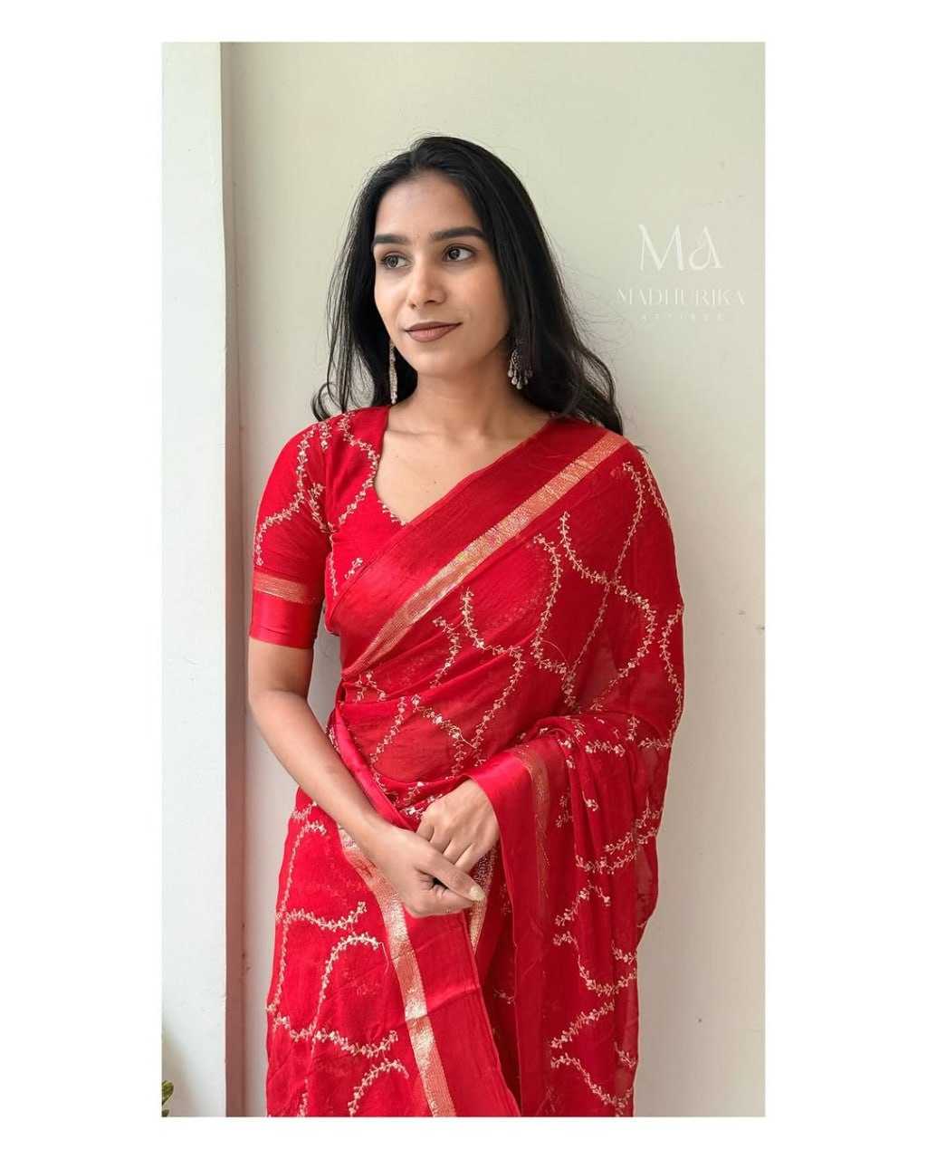 Red Silver Crunchy Embroidery Work Saree