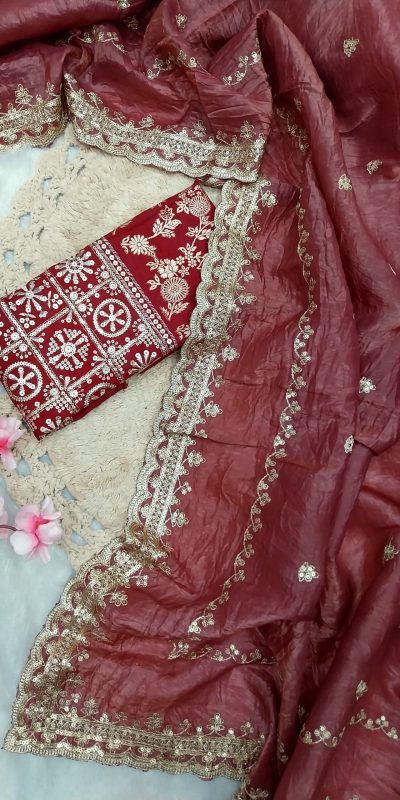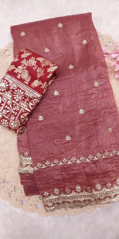 | Fabrics | Saree: Gold crush tissue silk saree with multi-sequence design work with heavy multi-sequence border Work :Paired with jacquard multi sequence worked blouse Type : Unstitched Work :Silk saree With Multi-Sequence |