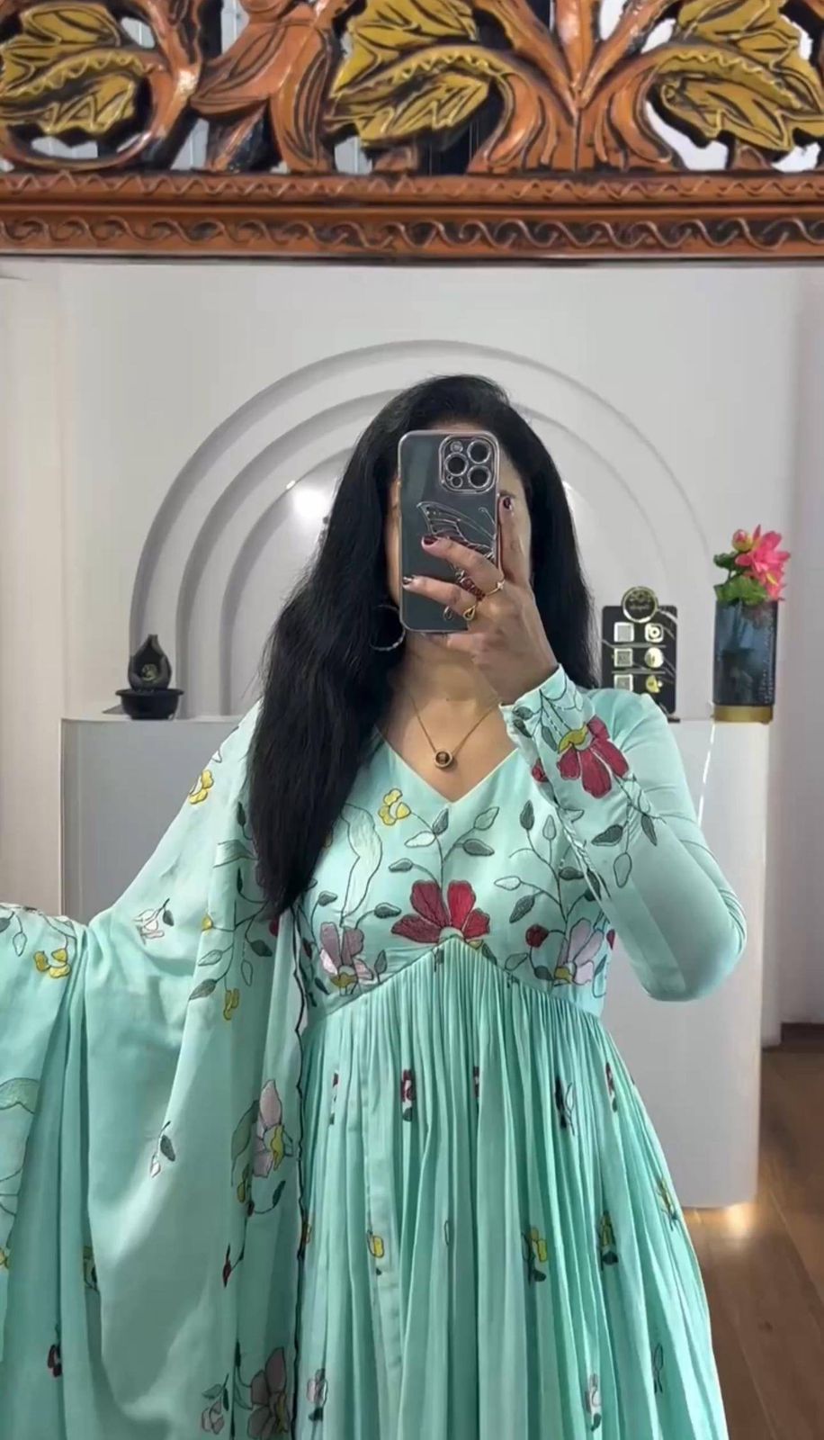 Sea Green Fox Georgette With Thread Embroidery Gown