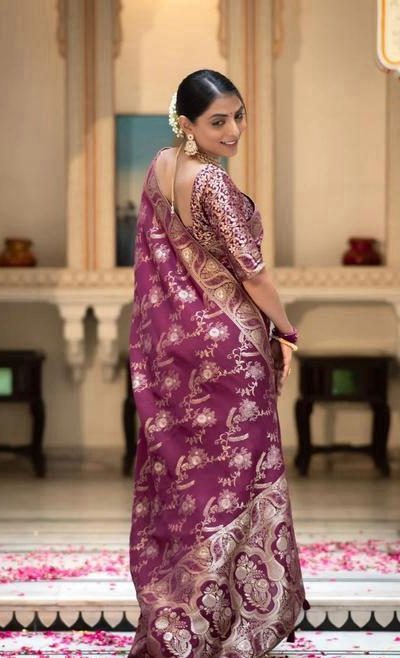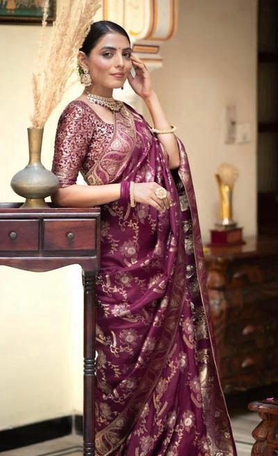 Splendorous Wine Color Soft Lichi Silk Jacquard All Over Saree