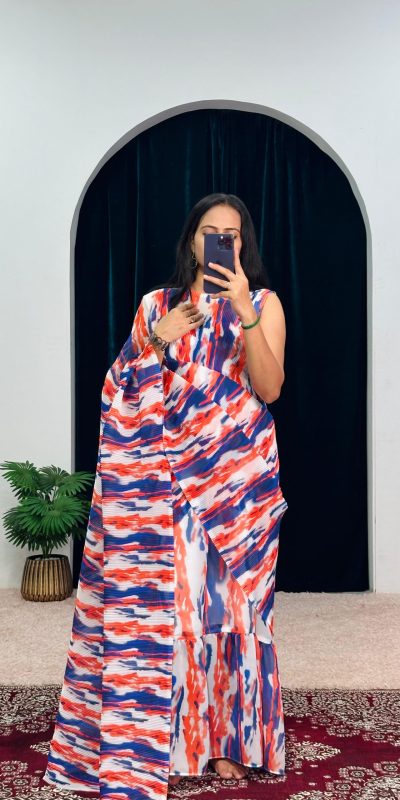 | Fabrics | Saree Gown Details Fabric:- Faux Georgette With Digital Print Flair:- 2 Meter With Ruffle Height:- 52-54 Inch Inner :- Micron Cotton Dupatta :- 2.5 Meter Crushed Fabric Attachable Pallu Dupatta With Gown(Extra Button Available For Attachment) |
