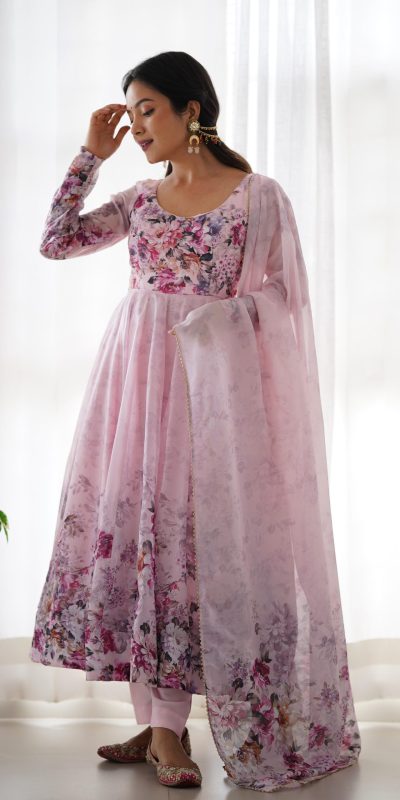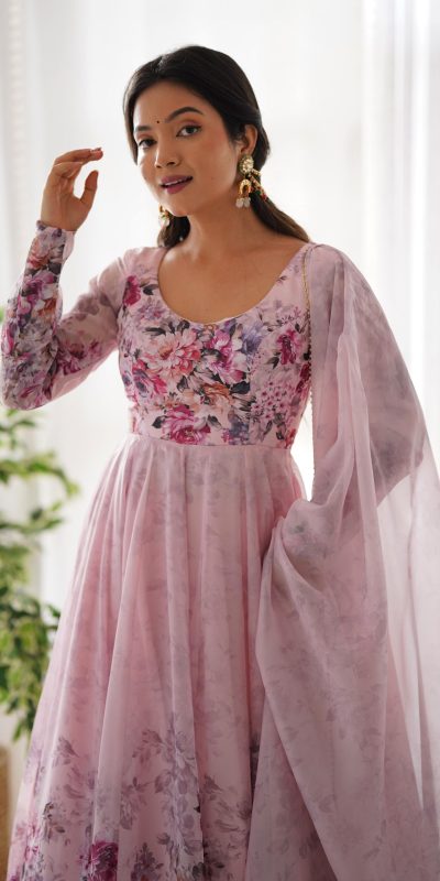 Stylist Pink Color Soft Organza Silk Print With Kali Gown