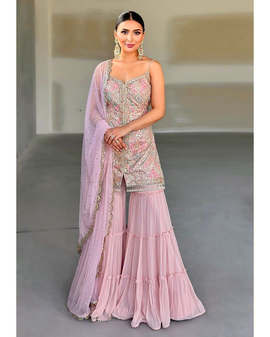 | Fabrics | Top :- Heavy Faux Georgette With 9mm and 5mm Sequence Embroidery Work. with *(Extra Sleeves Cloth pain ) inner :- Heavy Micro Cotton Length :- 37-38Inch Palazzo : Heavy Faux Georgette With Ready Made Less Work. (Fully Stitched Sharara Palazzo Styles and Length is 41-42) Inner :Micro Cotton Dupatta : Heavy Butterfly Net Material With Embroidery 5mm Sequence Work and Fabcy Lees |