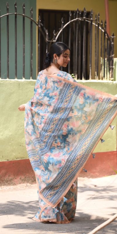 Sublime Sky Blue Color Linen Beautiful Digital Printed Work Saree