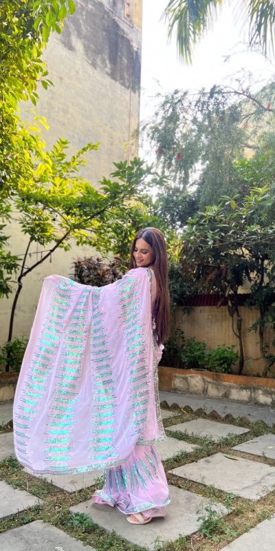 Work : Sequence work with Lace border with metti piping Blouse : Mono Banglory |