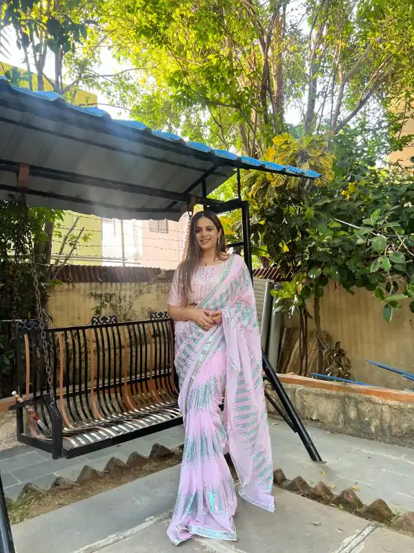 Work : Sequence work with Lace border with metti piping Blouse : Mono Banglory |