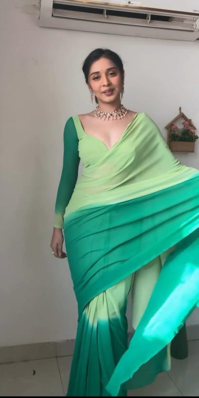 | Fabrics | Saree Fabric :pure soft Georgette silk Saree Work : All over the body Ready To Wear saree pista and green color combination Saree : 5.5 Mtr Blouse Fabric : multicolor Blouse piece Blouse: 0.80 CMtr Ready To Wear saree |