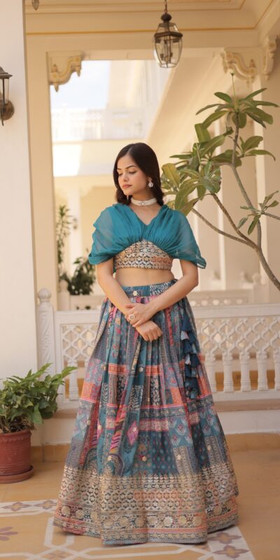 Teal Russian Silk Embroidery Work Lehenga Choli