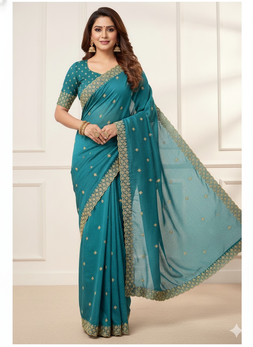 Teal Star Georgette Embroidery Work Saree