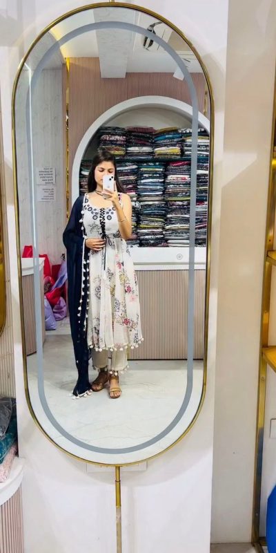 Fabric : Heavy 1000 Butti Georgette With Digital Print And Mirror Work With Pom Pom Lace Border With Fully Flair