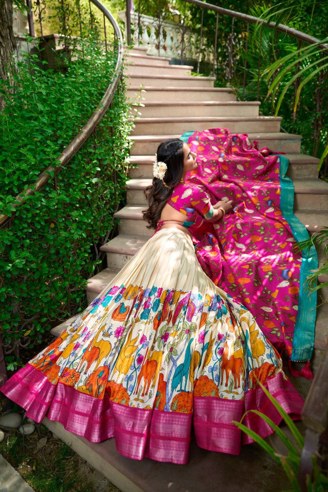 White Dola Silk Kalamkari Print Zari Lehenga Choli