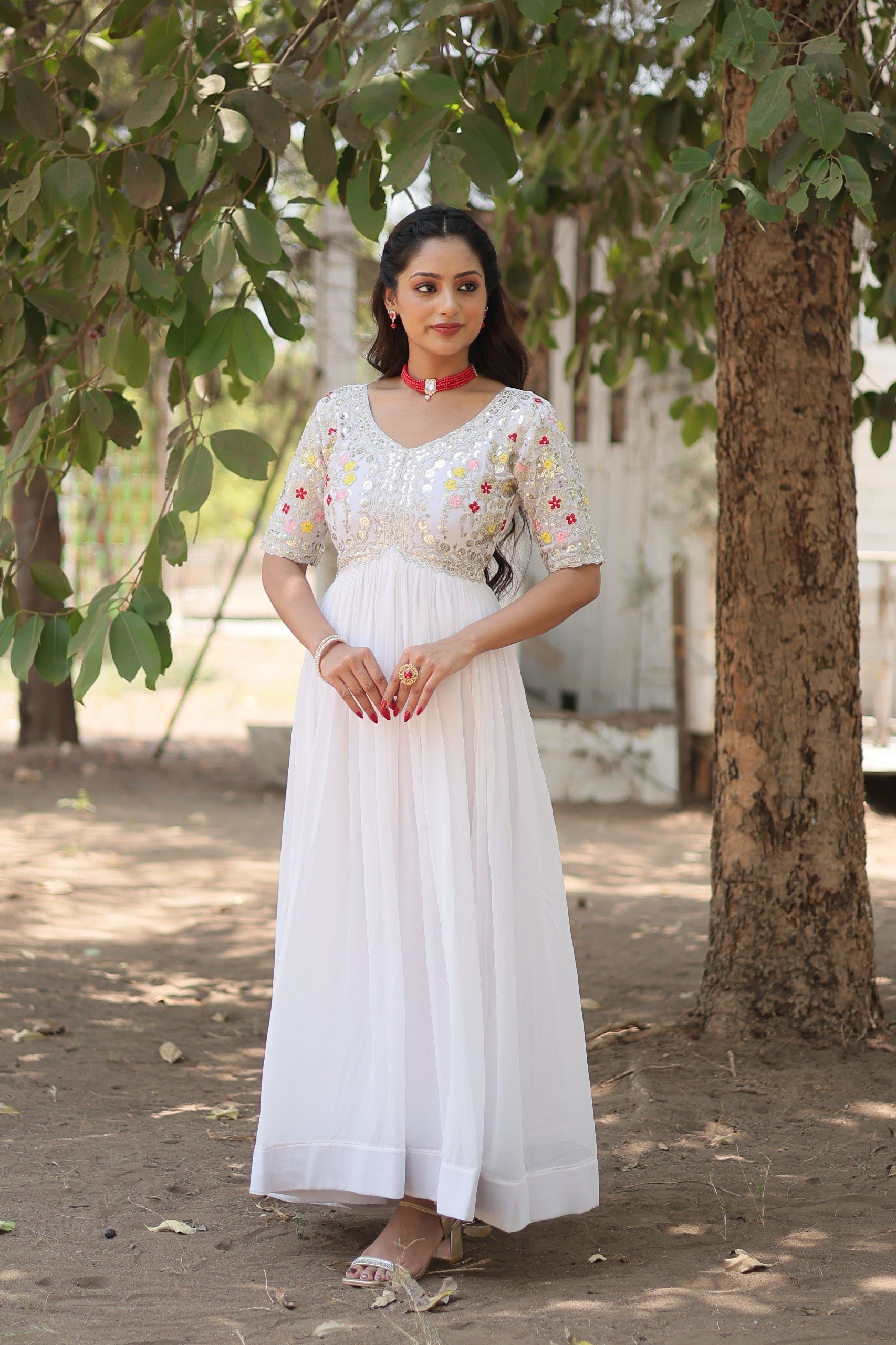 Gown :- Fabric & Work:- Faux Blooming With Embroidery Zari Sequins-work Size:- Free Size Semi Stitched Length:- 55 inch Flair: – 3.5 Mtr Lining:- Cotton (Full Inner Top To Bottom) Sleeve:- Half Sleeves Neck Type:- Fancy V Neck |