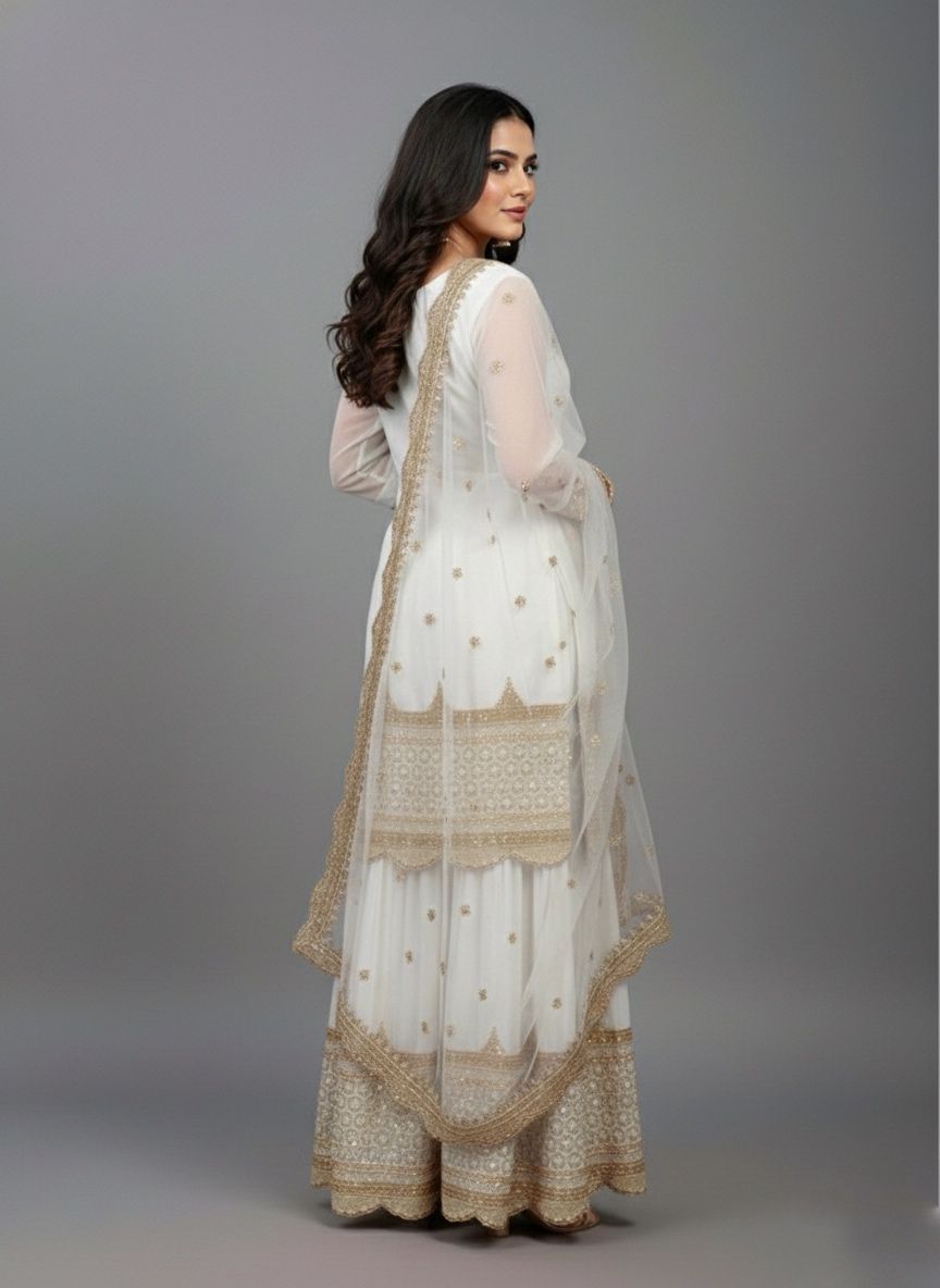 Top : Heavy Faux Georgette With Heavy 5mm Embroidery Sequence Work With Full Sleeve and Potli Button Inner : Heavy Micro cotton Length : 37-38 Inch Size : Free Size Work :Embroidery Sequence Work Type : Semi Stitched Palazzo :Heavy Faux Georgette With 5mm Embroidery Sequence Work With Fully Flair Palazzo inner :Heavy Micro Cotton Palazzo Length:40-41 InchDupatta : Heavy Net With 5mm Embroidery Sequence Work and Lace Border |