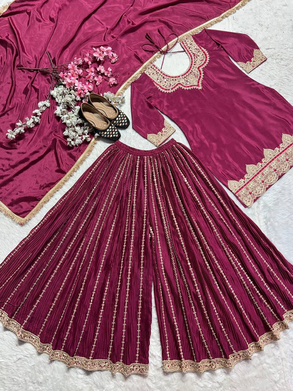 Sharara fabric :Pure Heavy Chinon Silk With Heavy Embroidery Coding Sequence Work (Fully Stitched)
