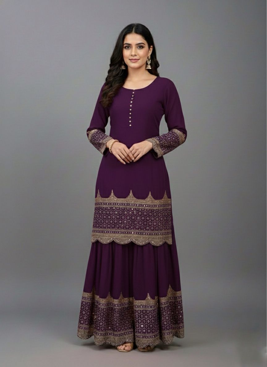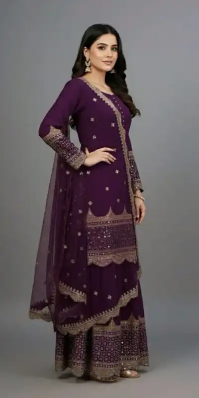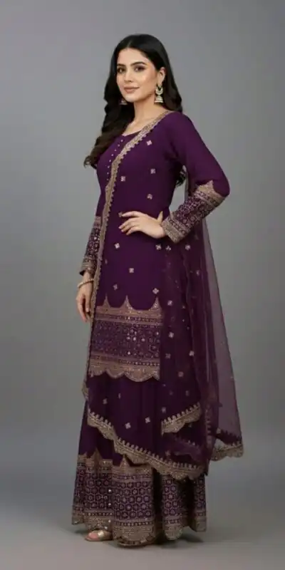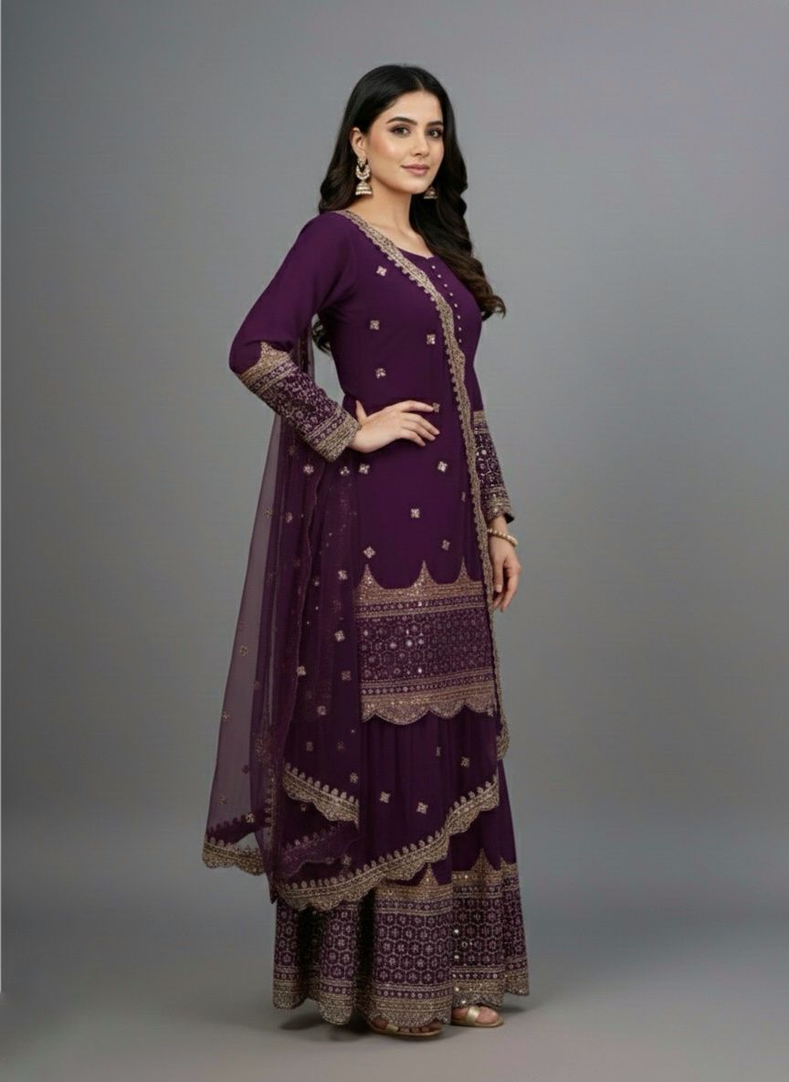 Top : Heavy Faux Georgette With Heavy 5mm Embroidery Sequence Work With Full Sleeve and Potli Button Inner : Heavy Micro cotton Length : 37-38 Inch Size : Free Size Work :Embroidery Sequence Work Type : Semi Stitched Palazzo :Heavy Faux Georgette With 5mm Embroidery Sequence Work With Fully Flair Palazzo inner :Heavy Micro Cotton Palazzo Length:40-41 InchDupatta : Heavy Net With 5mm Embroidery Sequence Work and Lace Border |