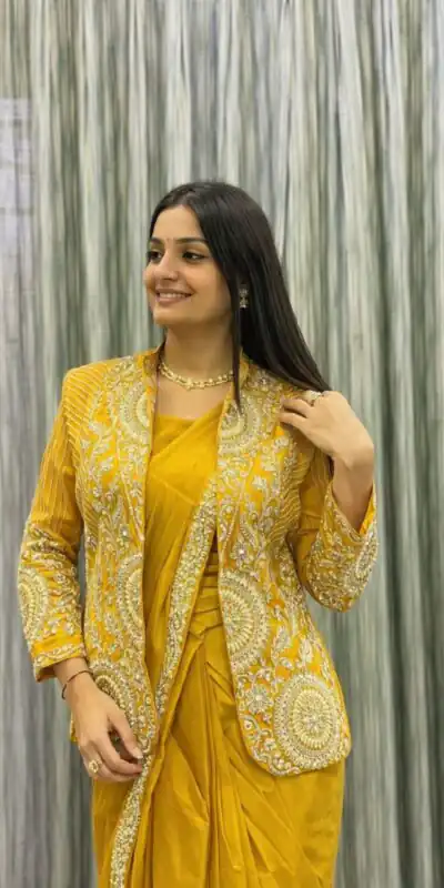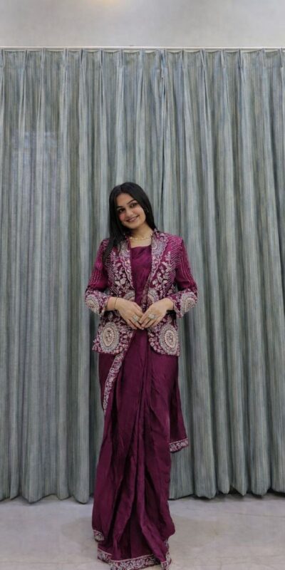 Saree Fabric : Heavy Rangoli Silk Work: Embroidery sequence cording work Stitching type : Ready to wear JACKET( Koti ) Fabric- Heavy Rangoli Silk Work- Embroidery Sequence work ( full Stitched) Size- Full Stitched up to 42 BLOUSE: Heavy rangoli silk |