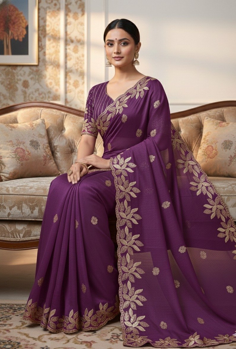 Wine Soft Organza Silk With Sequins Work Saree