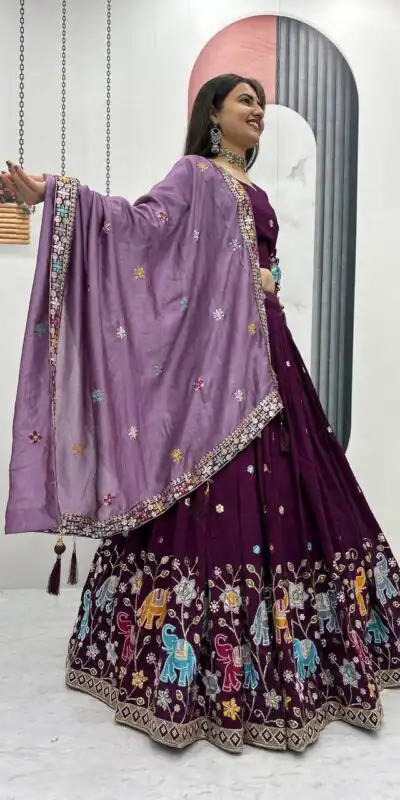Wine Vichitra Silk Lace Border Work Lehenga Choli