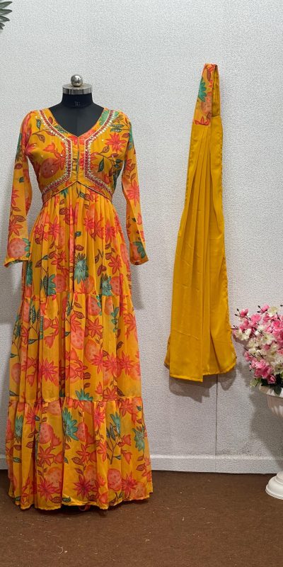 | Fabrics | Gown Fabrics : Foix Georgette Gown Inner : Micro Cotton Gown Work : Embroidered Sequence Work With Ruffle Gown Size : Free Size Semi Stitched Full Stitch Gown Length : 57 Inches Dupatta Fabrics : Georgette Dupatta Work : Fancy Digital Print Dupatta Size : 2.10-2.20 Mtr |